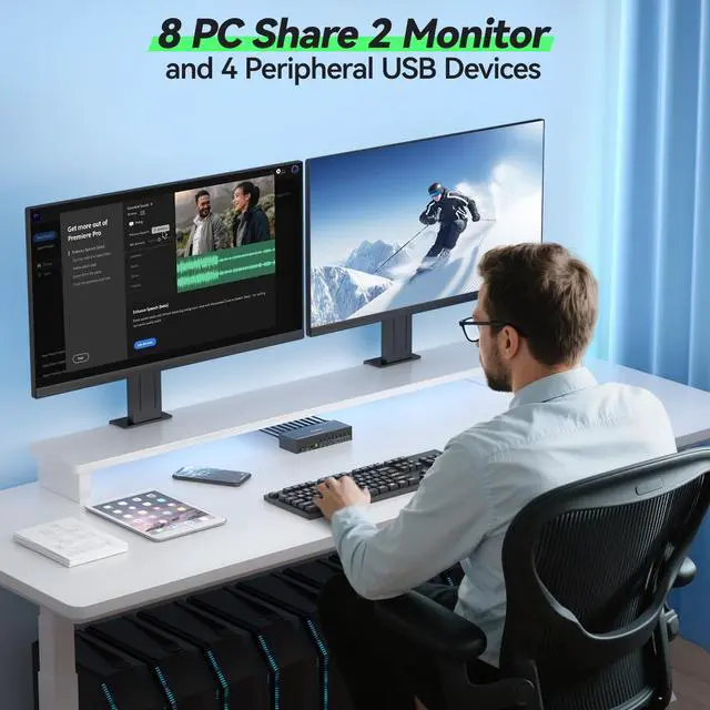 You can turn ON/OFF the EDID emulation function as require. ^^ Ultra HD 4K@60Hz 8 PC 2 monitors KVM switch displayport HDMI support resolution up to 4K@60Hz and backward compatible 4K@30Hz, 2560*1440@120Hz. The 4K KVM Switches also work with ultrawide monitors. ^^ 8 Ports USB 3.0 KVM Switch The 2 displays KVM switch integrates a 8 in 2 out HDMI displayport switch and a 8 in 4 out USB switch, with 4 USB 3.0 ports1*USB-C+3*USB-A) for keybaord, mouse, printer, U disk and other USB Peripheral devices. Supports ultra-fast USB 3.0 data transfer up to 5Gbps, transfer files in seconds, 10 times faster than USB 2.0, make your work and life more convenient.