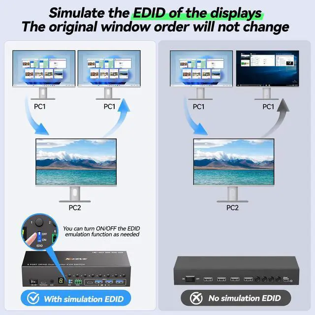 8 Computers 2 Monitors KVM Switch This 2 monitor KVM switch allows you to effortlessly manage up to 8 computers to share 2 monitors and 4 USB devices together. You can choose expanded mode and copy mode between two monitors as required, the extended mode can output two different screens and the mirror mode can output two identical screens. ^^ KVM Switch Dual Monitor with EDID simulation This 8 ports KVM switch dual monitor s, when the monitors are switched between computers, the original window position will not be changed, while other KVM switches require the user to rearrange the window order.