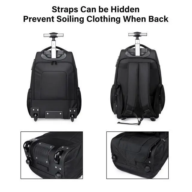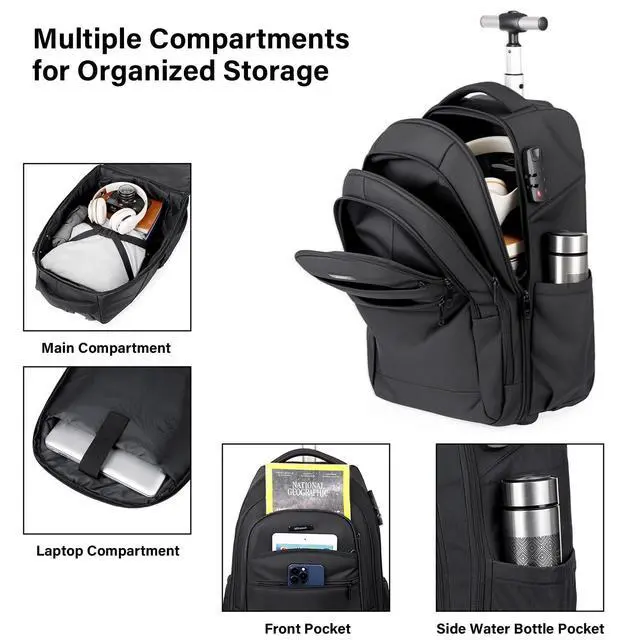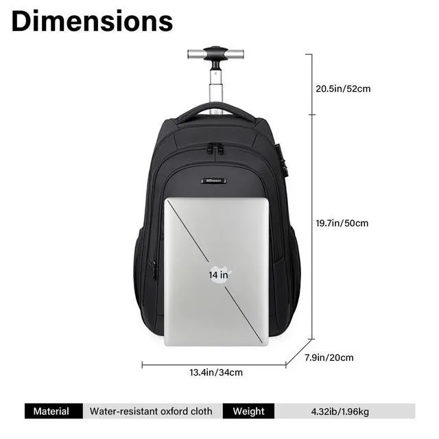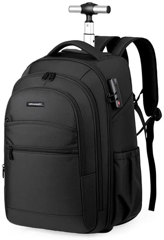 DescriptionMfinesun 17-inch Black Wheeled Backpack features a streamlined design that combines versatility with practicality. It includes silent wheels, an extendable aluminum alloy handle, a built-in padded laptop compartment, dedicated accessory pockets, dual side water bottle pockets, and elastic straps for securing clothing, all within a lightweight construction.