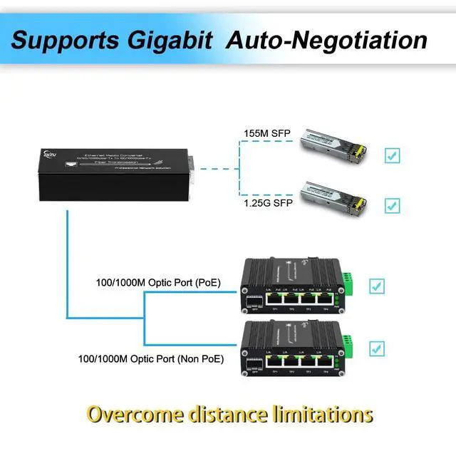 SFP Port: Supports both 100Mbps and 1000Mbps SFP modules with automatic speed detection. Fully compatible with 155M and 1.25G single-mode single-fiber SFPs, eliminating manual configuration and improving flexibility. ^^ Ultra-Compact, Space-Saving