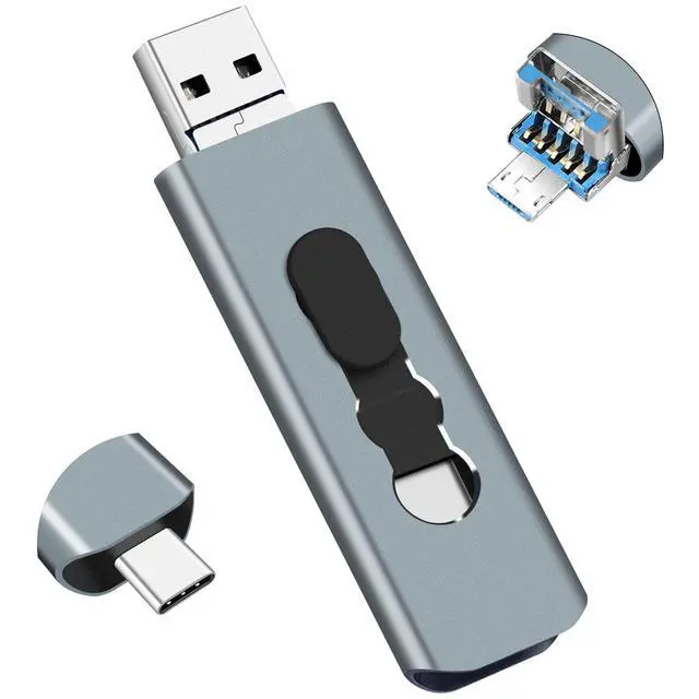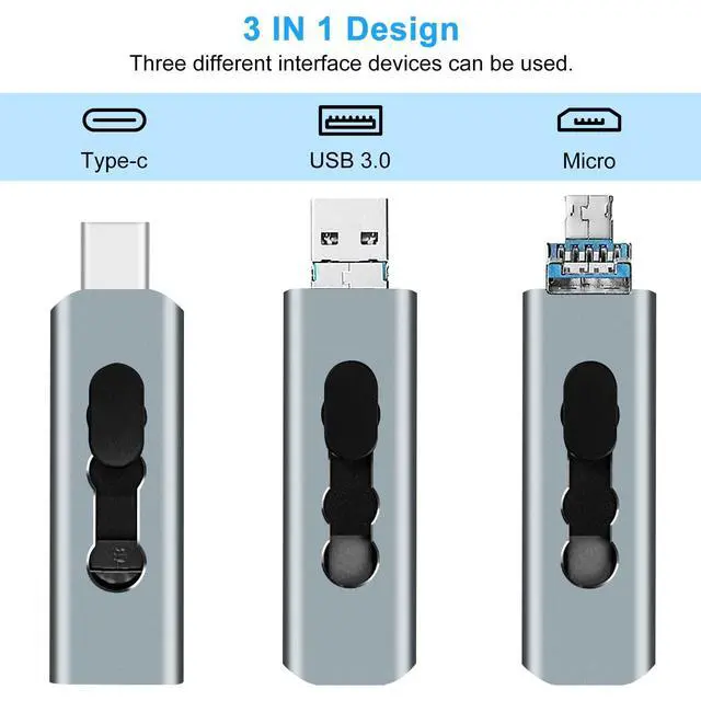 1. 3-in-1 Push-Pull USB Flash DriveEnjoy hassle-free data transfer between computers and mobile devices with our innovative 3-in-1 push-pull USB flash drive that supports Type C, Micro-USB, and USB 3.0 port, making it ideal for android phones and tablets. U disk is push-pull design, better protection interface, convenient daily use. ^^ 2. Wide compatibilityThe three-in-one interface design meets the different interface requirements of a variety of devices, supporting type-c interface, micro Android phone interface and usb interface. No longer need three different interfaces of the U disk, this U disk is equivalent to three U disks.