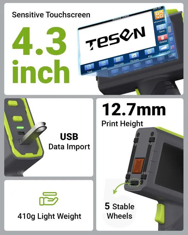 Ergonomic Design: Weighing only 410g, the Tesen hand held printer is perfect for portable use. Its 4.3 -inch HD capacitive touchscreen allows for easy operation, while the ergonomic handle is designed to reduce hand fatigue during prolonged use, making it ideal for extended tasks. ^^ Superior Stability for