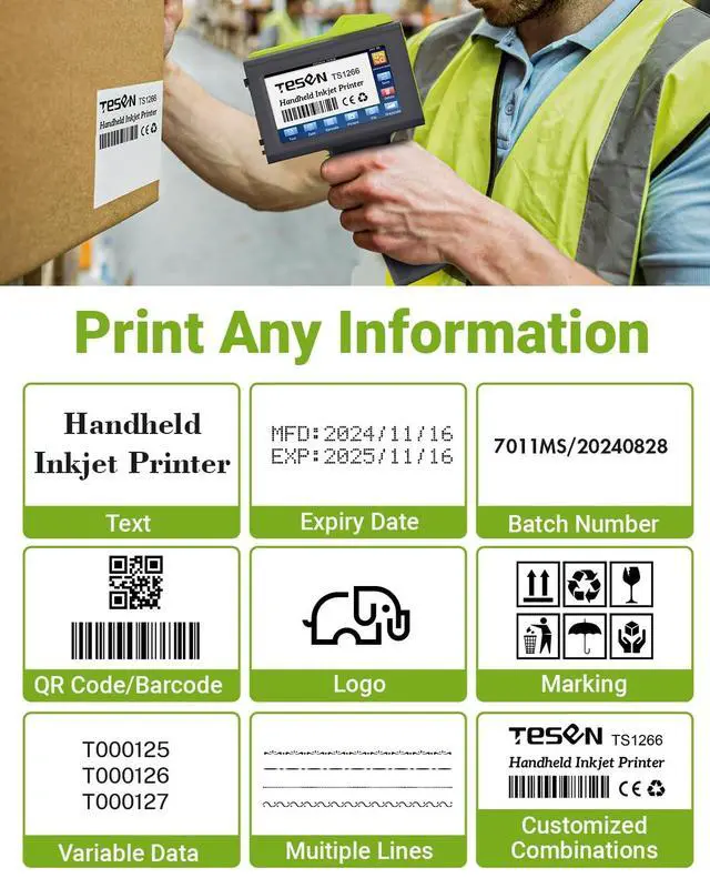 Continuous Use: Experience unmatched performance with Tesen handheld inkjet printer, offering over 16 hours of uninterrupted use. Minimize downtime and maximize productivity with a printer that keeps up with your workflow, reducing the need for frequent recharges. ^^ Adjustable Print Height and Broad