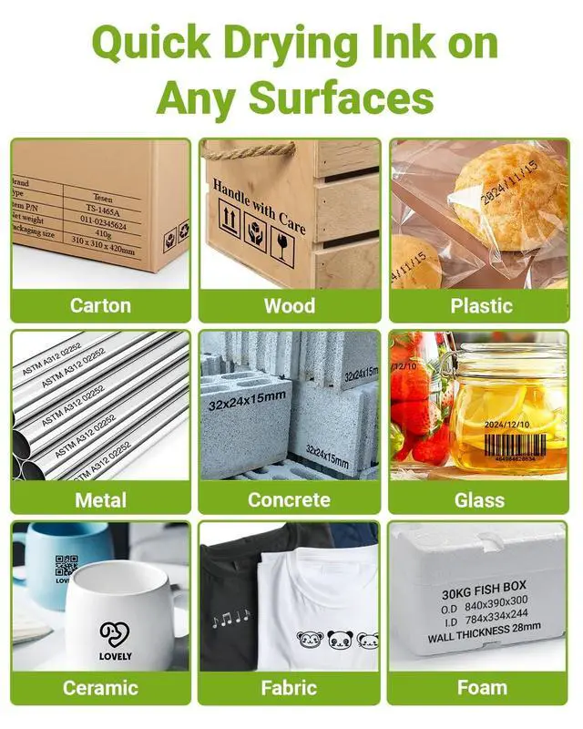 Any Surface: Equipped with a 42ml quick-drying ink cartridge, this printer delivers crisp, clear prints on virtually any surface, whether porous or non-porous, flat or curved. It's ideal for a wide range of industries, including food and beverage, pharmaceuticals, and manufacturing, to meet diverse printing needs like product coding, packaging, labeling, and more. ^^ Lightweight and