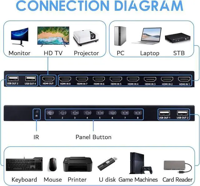 Applicable to XBox, PS3, PS4, Blu-ray DVD players and TVs, suitable for conference, office, home, financial security, multimedia teaching, etc. ^^ 2 Switching Methods - You can easily switch between computers with the IR remote control or the panel button, and you can see which computer you are using by the LED indicator. No need to install drivers, plug and play, easy to use. The remote control uses 2 * AA batteries. The product is powered by USB. ^^ High-quality Materials - Made of sturdy metal, which prolongs the service life, quickly dissipates heat and ensures the stable operation of the HDMI switch.