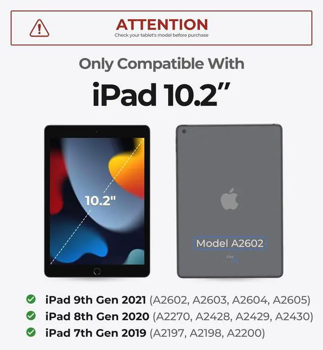ENHANCED COMPATIBILITYThe magic style keyboard case is compatible with iPad 9th Generation (2021, 10.2" ), including models A2602, A2603, A2604, A2605; compatible with iPad 8th Generation (2020, 10.2" ), including models A2270, A2428, A2429, A2430; compatible with iPad 7th Generation (2019, 10.2" ), including models A2197, A2198, A2200.