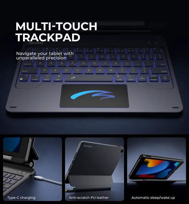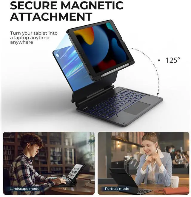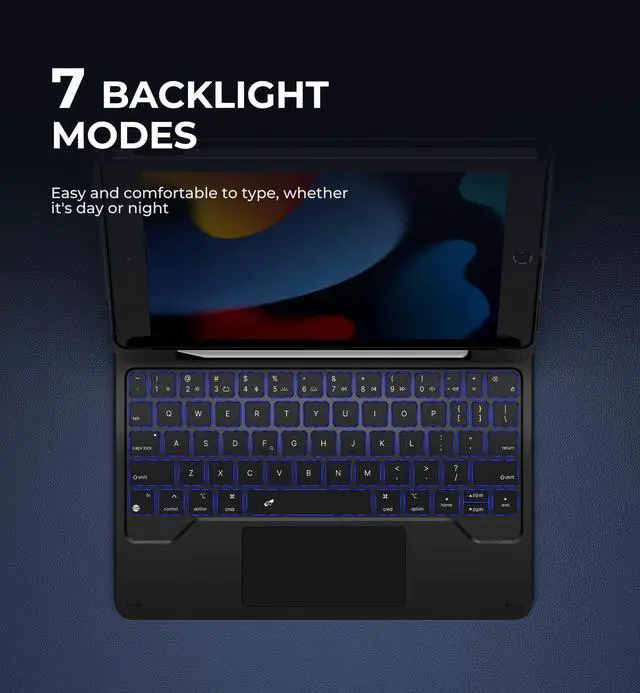 Note: iPad and Apple pencil NOT included. ^^ EASY-SET MAGNETIC STANDThe durable aluminum alloy hinge guarantees a sturdy magnetic connection, instantly transforming your tablet into a laptop. Enjoy a floating cantilever stand with customizable angles tailored for typing, reading, and immersive viewing. It's a perfect companion for travel, work, study and versatile daily use. ^^ PC CASE WITH PENCIL HOLDERThe detachable back case designed with a built-in pencil holder offers a sturdy protection to your iPad, as well as a quick access and secure storage to your Apple pencil. The case can also be set up in portrait mode for a better viewing experience. ^^ BUILT-IN TRACKPADRevolutionize your iPad experience with our keyboard case featuring an ultra-precise and dependable smart touchpad. Seamlessly supporting multi-finger gestures, it opens up a new realm of control with actions like tap, pinch, scroll, swipe, and more. Navigate through tasks with unparalleled speed, whether you're editing documents, browsing the web, or crafting presentations. ^^ BACKLIT & RECHARGEABLEIlluminate your typing with 7 solid color backlights and 3 adjustable brightness levels. The long-lasting 650mAh battery provides up to 200 hours of working time and 1200 hours of standby time on a single charge.