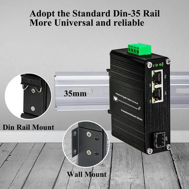 Deploy: Designed in a mini housing ( 3.74" x 2.76" x 1.18" ), the converter supports DIN-rail and wall mounting for flexible installation in space-sensitive applications. ^^ Wide-Range Power Input Supports 12~48V DC dual backup voltage input, enabling stable operation across varying industrial power conditions and ensuring continuous uptime.