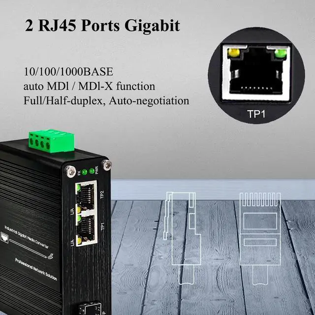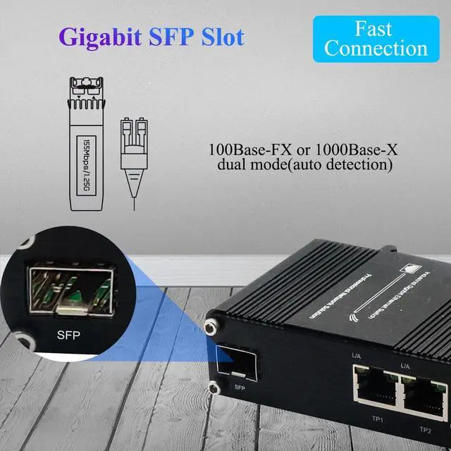 Seamless Fiber: Features 1x 100/1000BASE-X SFP port and 2x 10/100/1000BASE-T RJ45 ports with auto MDI/MDI-X, offering flexible integration between fiber optic and copper networks.