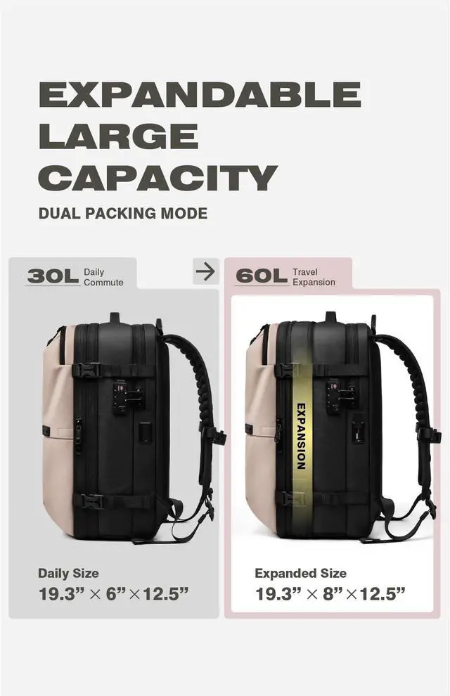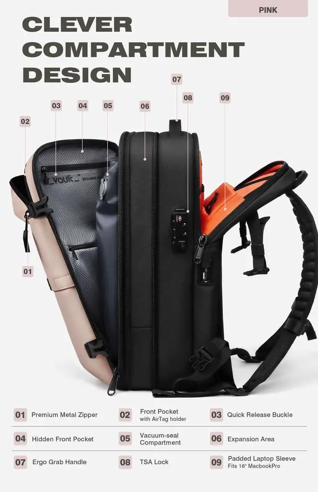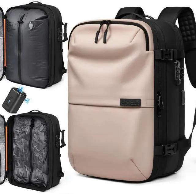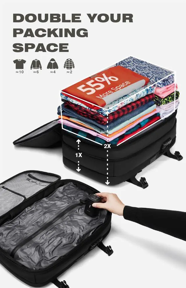Revolutionary Vacuum Compression Technology The AirVault backpack features an integrated vacuum compression system with a built-in air pump, capable of storing 18-20 spring garments and reducing storage space by over 50% (even more for down jackets). When fully expanded, the backpack achieves an impressive 70L capacity, comparable to a 24-inch suitcase. ^^ Versatile Air Pump with Multifunctional FeaturesThe included multifunctional air pump handles deflation and inflation tasks (perfect for items like swimming rings) ^^ Your Ideal Travel CompanionThe AirVault backpack comes equipped with a TSA-approved combination lock, USB 4.0 charging ports, a luggage attachment strap, thickened and widened shoulder straps, breathable materials, and high-quality zippers.