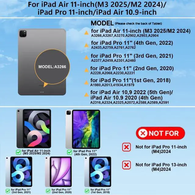 Number: A2316/A2324/A2325/A2072). Not for other devices. Please be kindly check the model number No. starting with the letter "A" of your tablet back before order ^^ 7-Color Backlit Keyboard Case for iPad Air 11/Pro 11 InchFrom dawn to dusk, adapt effortlessly! Adjusting 7 backlight and 3 levels of brightness ensures clear visuals in every setting, enhancing your immersive experience.