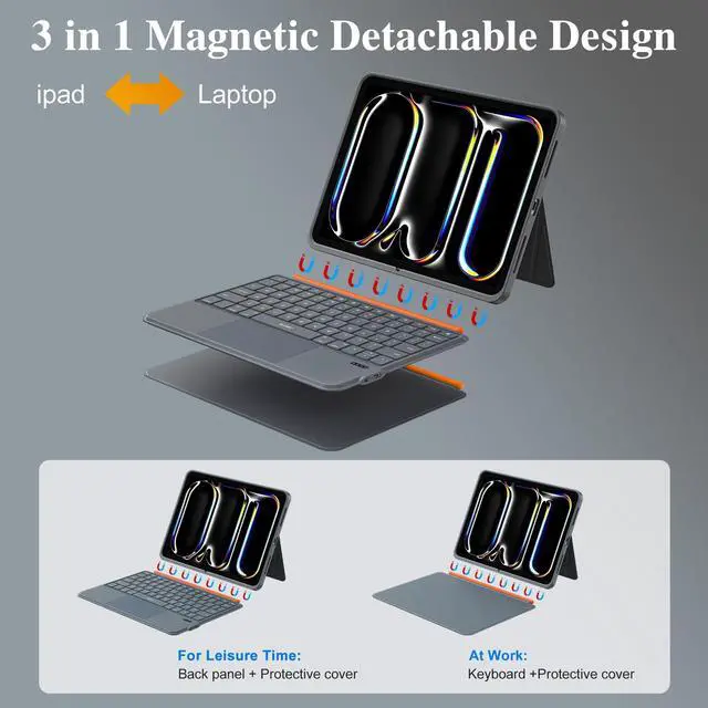 Design: Detachable magnetic iPad pro m4 11 inch keyboard case stand, strong magnets secure stable attachment. Instantly transforms iPad case into a typing keyboard or adjustable viewing stand. Suitable for movies, video calls and meetings. Ideal for office, travel and outdoor adventures. PU Leather full-edge coverage, protects iPad from drops and scratches ^^ Slim Design &