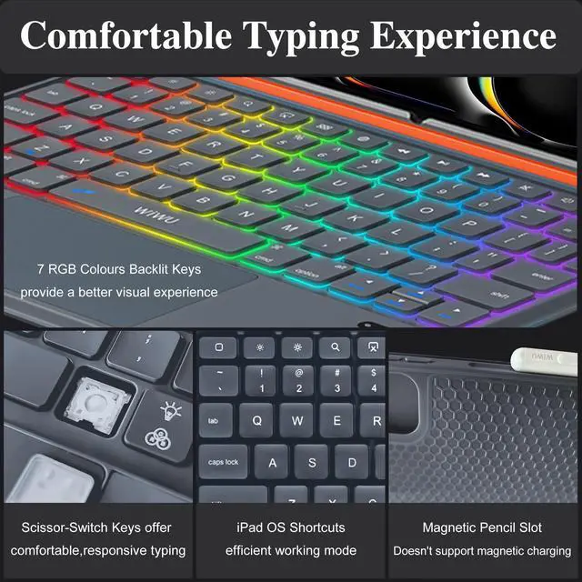 Battery Life: Scissor-switch keys offer comfortable, responsive typing with quiet 1mm travel, suitable for libraries and offices. USB-C recharging in 2 hours for up to 100 hours of use. 7 RGB colours backlit keys for comfort and productivity in any dimly lit area ^^ Precise Touchpad & iPadOS