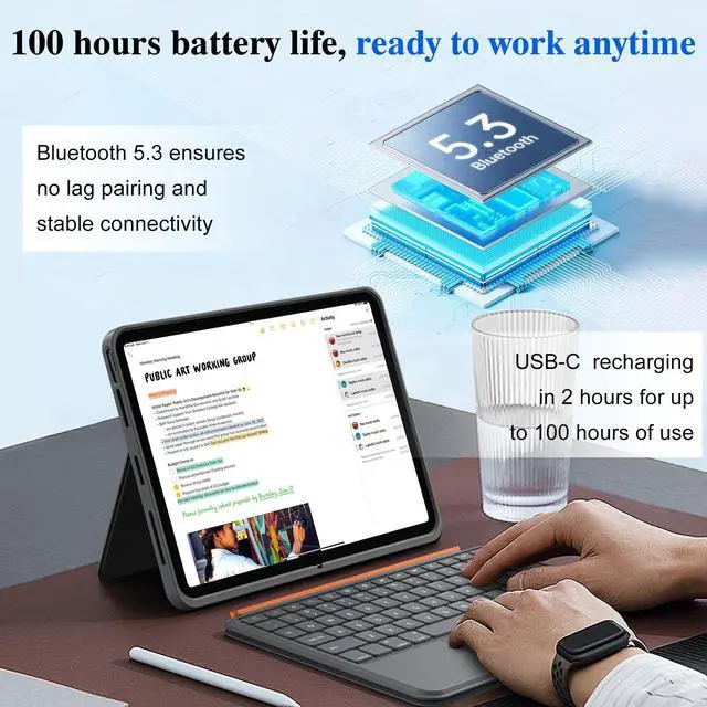 Bluetooth No Lag: Keyboard iPad just 0.25 inch ultra-thin design. The foldable stand adjusts from 0to 170, fill needs for different angles. Bluetooth 5.3 ensures instant, no lag pairing and stable connectivity. Easily switch to work mode during commutes or in cafes ^^ Silent Backlit Keys & Long