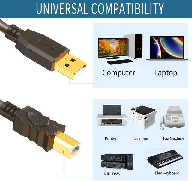 Printer Cable: GOSYSONG USB 2.0 printer cable is ideal for connecting the scanner, printer, server, hard drive, camera and other USB Type B devices to laptop, computer (Mac/PC) or other USB-enabled device for data transfer.