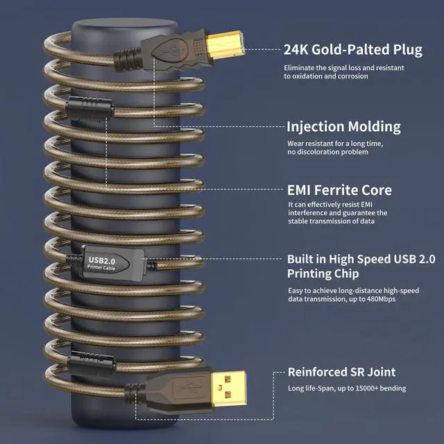 ^^ High-speed Transfer: Up to 480 Mbps transmitting data speed for USB 2.0 devices, USB 2.0 printer cord is backwards compliant with full-speed USB 1.1 and low-speed USB 1.0. Multiple layers shielding provides more stable data transmission and more efficient work way.