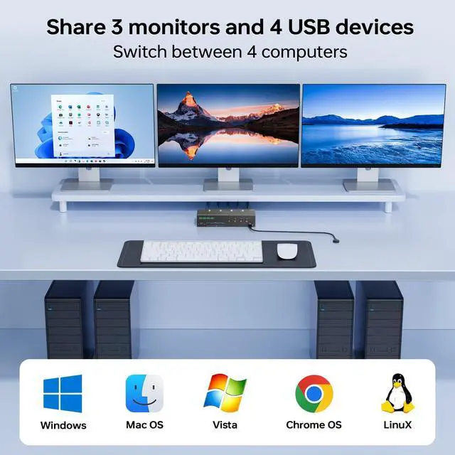 2 + Triple Monitor KVM Switch This KVM switch 4 computers 3 monitors perfect for hooking up 4 computers to share one set of wired or wireless keyboard mouse and 3 monitors (supports extended and mirrored display modes).: extended mode can output three different screens and mirror mode can output three identical screens. ^^ KVM Switch 3 Monitors 4 Computers Ultra HD 4K@60Hz 3 Monitors KVM Switch support resolution up to 4K@60Hz2K@120Hz and backward compatible with lower resolution.