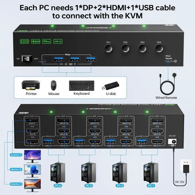 Note: Monitors connected to 2 * HDMI outputs support EDID emulation, DP does not support it. ^^ & -- KVM switch 3 monitor driver-free for Windows, Mac, Linux and most other major OS. support many kinds of input devices such as PC, Laptop, Mini box. it is widely applied for Office, Hone, Game, Meeting, etc.. You can press the button or use the wired remoteincluded to switch the computers. LED indicate the active PC. ^^ -- 2*+1*+* be connected to get triple screens display properly. Adapters will be needed if your PC does not have 1*DP+2*HDMI ports. This 4 computers 3 monitors KVM switch, such as DP to HDMI, Mini DP to DP, USB C to DP/HDMI adapter and USB C docking station. ^^ -- 1x Triple Monitor KVM Switch, 4x USB 3.0 Cable, 1x Power Adapter, 1x Wired Remote, 1x User's Manual. 12 months war-ranty. If you have any questions about the product, 24-hour service. ^^,,, 4,,.