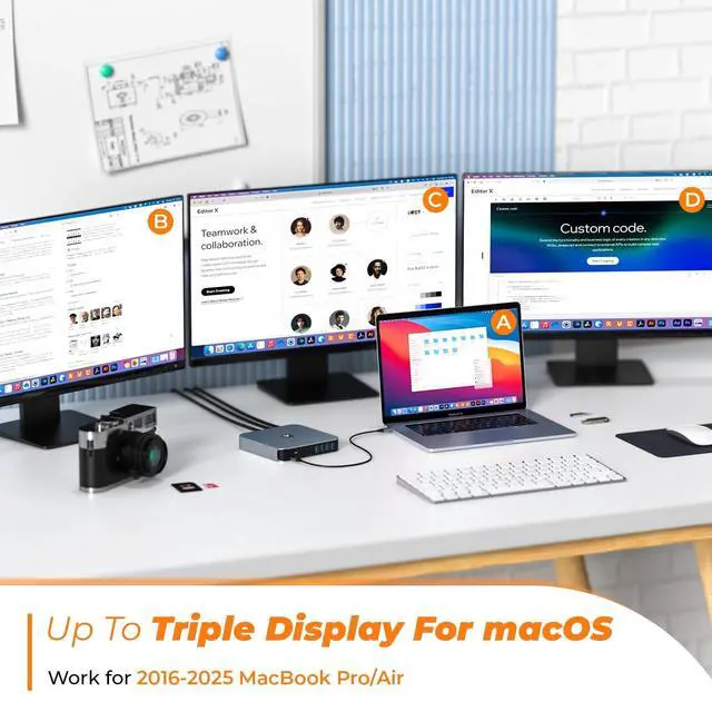 All-in-One Universal Docking Station: This powerful universal laptop docking station packs 13 essential ports, 2HDMI, VGA, 2USB-C, 4USB-A 3.0, Gigabit Ethernet, SD/TF card slot, 3.5 mm Audio In/Out, and 60W power supply. Sturdier, more stable, and with a sleek unique design compared to basic dual-monitor docksperfect for M1/M2/M3/M4 MacBook users and anyone needing all-around daily connectivity ^^ Triple Display Support Dual 4Ultra-Clear
