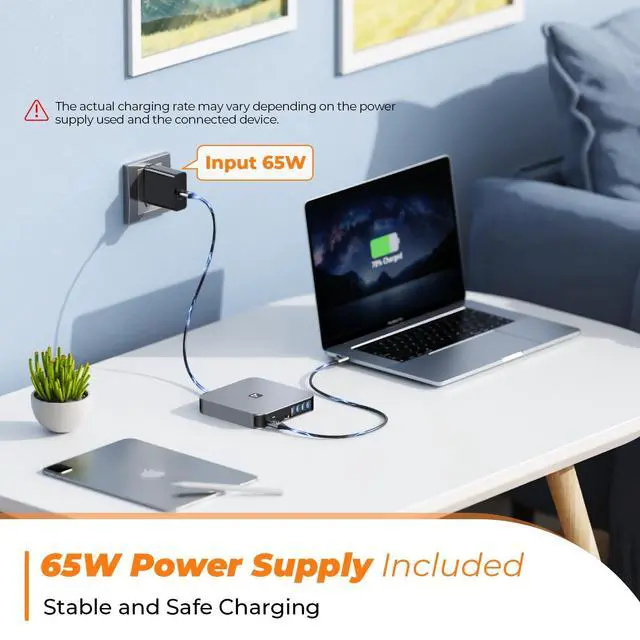 Power Supply: The USB C docking station comes with a 65W power adapter that delivers up to 57W fast charging for your laptop. Built-in over-voltage, over-current, and short-circuit protections ensure safe, stable chargingno more worries about device damage while powering your MacBook/HP/Dell/Lenovo or other laptops ^^ 5Gbps