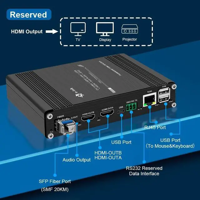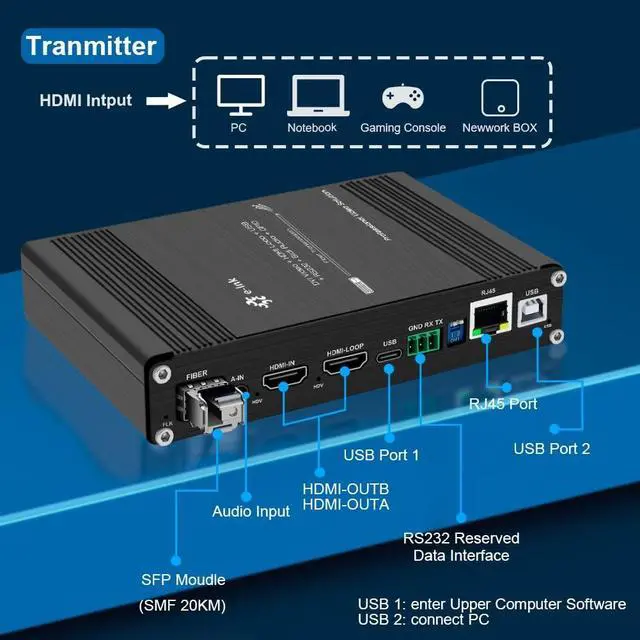 Note: The USB ports on this device are designed exclusively for standard keyboard and mouse signal transmission as part of KVM functionality. It does not support other USB devices such as game controllers, USB flash drives, webcams, or Xbox One wireless adapters. The built-in RJ45 port supports 10/100Mbps Ethernet with TCP/IP protocol. It is intended for network signal pass-through or remote equipment management in industrial environments. It does not function as a standard internet access port and cannot provide general-purpose LAN connectivity. Package Includes1 HDMI KVM Fiber Extender Transmitter1 HDMI KVM Fiber Extender Receiver2 10G SFP Moudle1 USB 2.0 Cable2 Power Adapter (12V/1A)1 User Manual