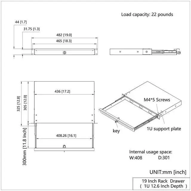 QiaoYoubang 1U Rack Mount Drawer with Lock and Key is designed for 19 inch Network Equipment/Server/AV Rack or Cabinet. 1. Extra Cabling Holes at the