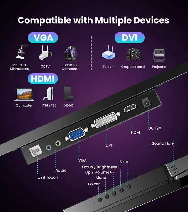 You can effortlessly swipe, scroll, zoom, or select elementsno additional drivers or software needed. To enable touch functionality, simply connect the monitors USB-B port to your device. Setup is incredibly simple and ready to use right away. ^^ VERSATILE CONNECTIVITY FOR LAPTOPS & DEVICES - Easily connect via HDMI, VGA, or DVI, ensuring compatibility with most devices. Enjoy clear, integrated sound with built-in stereo speakersperfect for conference calls, casual gaming, or streaming. While the built-in speakers provide solid audio, the 3.5 mm headphone jack delivers louder, more private sound.
