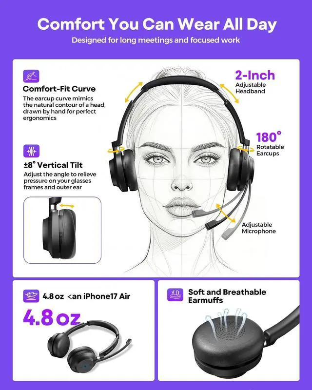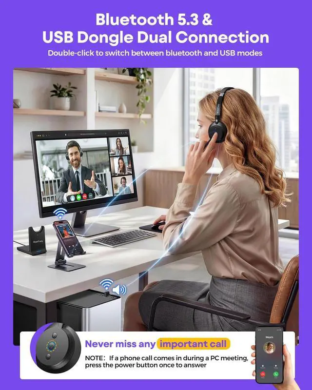 Soft and breathable earmuffs help reduce heat buildup during extended wear. With vertical tilt adjustment up to 8 degrees, the earcups adapt naturally to different head shapes, helping relieve pressure on glasses frames and the outer ear. ^^ Dual Connectivity OptionsEffortlessly switch between devices with this Bluetooth headset featuring Bluetooth 5.3 and a plug and play USB dongle. Simply double click the power button to toggle between Bluetooth mode and USB mode. When you are in a video meeting on your PC and receive an important call on your phone, just press the power button to answer instantly, so you never miss a call.