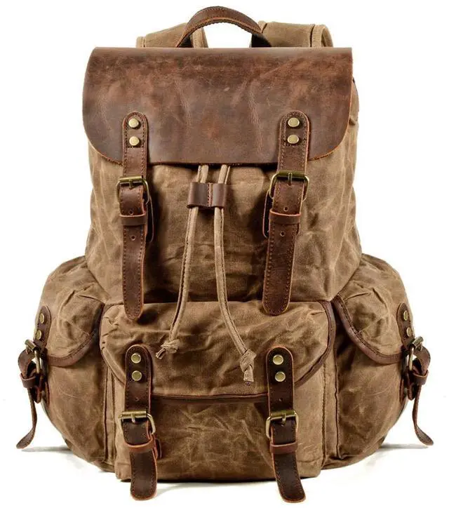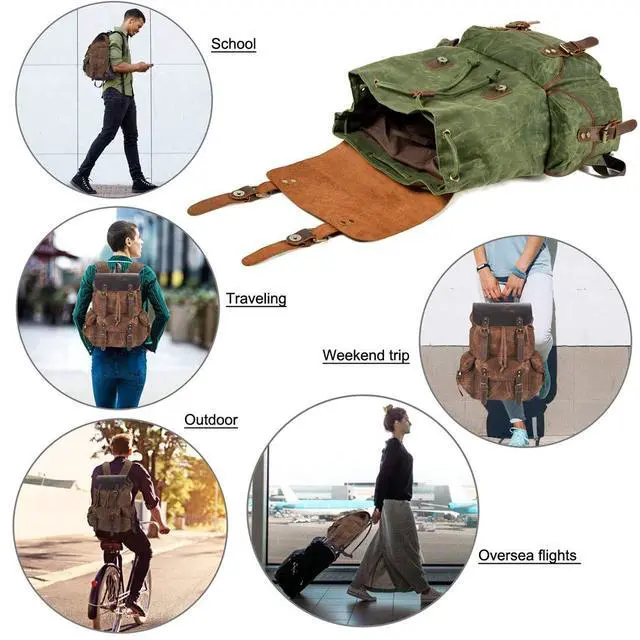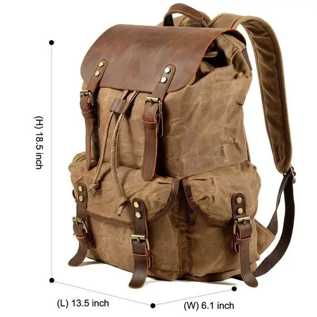 EXCLUSIVELY FOR ADVENTURERS - THIS ITEM IS NOT INTENDED FOR USE BY CHILDREN 12 AND UNDER. Our basics travel backpacks for men was designed for the doers in life: Made with waterproof & durable waxed canvas to protect your tech and with genuine crazy horse leather that allows for heavy duty, daily use. International travel or take it with you on a daily basis, to the edge of the world ^^ CARRY EVERYTHING - Big & spacious interior with 13.5 (L) x 6.1 (W) x 18.5 (H) allows you to carry large laptops (17), tablets & all necessary apparel. Main compartment features a padded sleeve with open wall pockets and stays secure under a genuine leather flap with drawstring closure ^^ CREATED FOR THE ROAD - We make no cutbacks in craftsmanship so as to never be surprised by something breaking right when its not supposed to. Boasting a solid construction with tensile stitching & rust-resistant, zine-alloy rivets & hardware, our travel leather rucksack is a mighty road-beast ^^ FOR DAILY, HEAVY-DUTY USE - Traveling, Hiking, Camping, Shopping, you name it, our travel bag will be your trusty companion through it all. With a spacious main pocket as well as 3x storage pockets for all your needs, you can carry your laptop, cameras, tablets, iPhones, clothes & gadgets, in unparalleled fashion ^^ EVERYDAY LEATHER BACKPACK - Canvas leather rucksack can be used as a daypack, international travel backpacks, satchel backpacks, travel backpack purse, outdoor backpacks, hilking backpacks, sport backpacks, weekend shopper leather backpacks