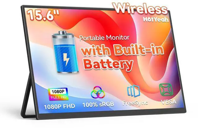 HotYeah 15.6 in Rechargeable Wireless Portable Monitor Go Wireless Stream content instantly via AirPlay & Miracast. Built-In Battery for Daily Use 4000mAh rechargeable battery delivers 45 hours of screen time. Take it anywhereno outlet hunting required. Smart Auto-Rotation for Phones Screen flips automatically between portrait and landscape when you tilt your phone. Wired Options Included Two USB-C ports + HDMI port. When the battery runs low, plug in the included USB-C cable or use the HDMI + power adapter for added convenience. Stunning 1080P Full HD Display 100% sRGB color, 300 nits brightness, 1000:1 contrast, 16.7 million colors, and 6800K color tuning for bold, lifelike visuals.