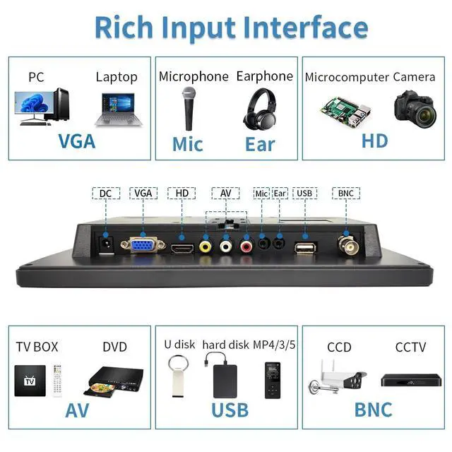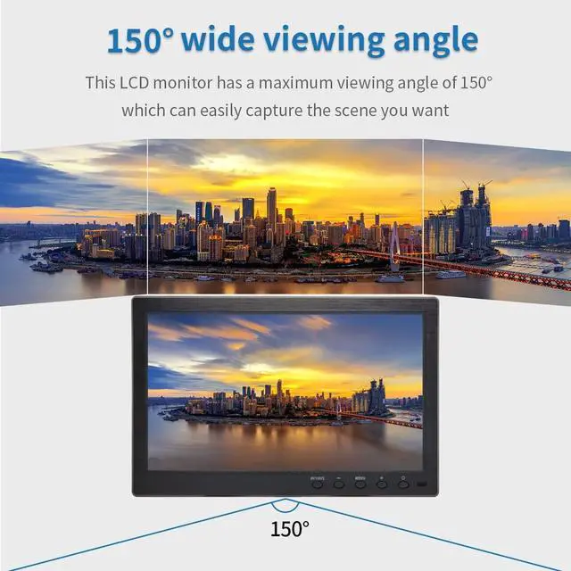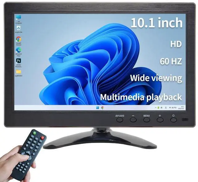 AC100-240V~50/60HzOutput: DC12V-1APanelsize/Aspect ratio 10.1 inch/ 16:9 Resolution1024 (H) *600 (V) Effective viewing area 222.72 (W) * 125.28 (H) mmViewing angle150 (H) *105 (V) Brightness300cd/Contrast 500:1 Ressptonse time12msVideo input1Vp-PcvbsVGA input640*480/Hz800*600/Hz1024*600/HzOperating temperature0-40Scope of applicationgames, DSLR, DVR, PC, Laptop, DVD, VCD, TV BOX, CCTV, Surveillance cameras, etc. How to use it as a second monitorAfter power on, connect a laptop or desktop computer via VGA or HDMI channel. On the computer's control panel, select Display Select Screen Resolution. Click Detect or Identify, when two monitors 1 and 2 appear on the screen, you can choose to copy or expand. Product packaging accessories 10.1" monitor*1Power Adapter*1HD cable*1VGA Cable*1BNC Cable*1Adjustable Stand*1Stand-Sticke*1Remote Control*1User Manual*1