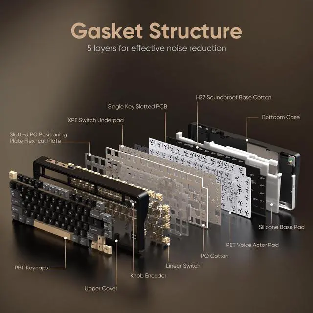 (Note: FN+Q/W/E to switch between BT1 /BT2/BT3 device. Not recommended for accountants or other numerical workers). ^^ Hot Swappable SwitchesThe hot-swappable keyboard is a game-changer! Built-in hot-swap PCB lets you replace 3-pin or 5-pin switches without soldering, giving you a wide choice. Built-in pre-lubricated pink shafts make typing smooth and comfort. Comes with spare pre-lubricated shafts and a key puller for you to experiment with different switches freely to find the perfect feel for your typing style or gaming needs ^^ Satisfying Creamy SoundGasket keyboard truly shines with its distinctive construction and superior performance in mechanical keyboards. Compared to Top-Mount Design, the Gasket Design has five-layer shock absorption and a single-key positioning plate. The unique design allows for a more even keystroke feel on the keyboard and enables full-key anti-ghosting. This results in a softer and more comfortable typing experience. It will be ideal for gamers and typists alike. ^^ Full RGB & 4000mAh BatteryThe K65 mechanical keyboard with 1.68 million RGB colors and a rechargeable 4000mAh battery can light up diverse atmospheres. Use FN combinations, CNC knob, or software to set RGB light modes (like rhythm lights), color, speed, and brightness.