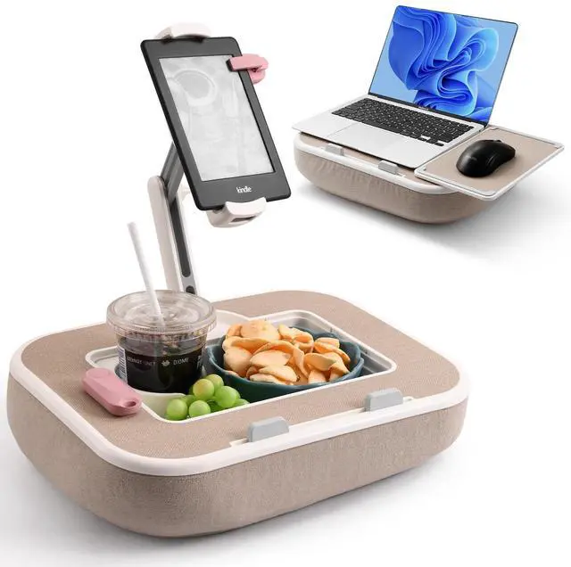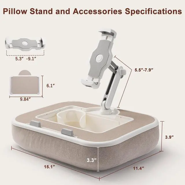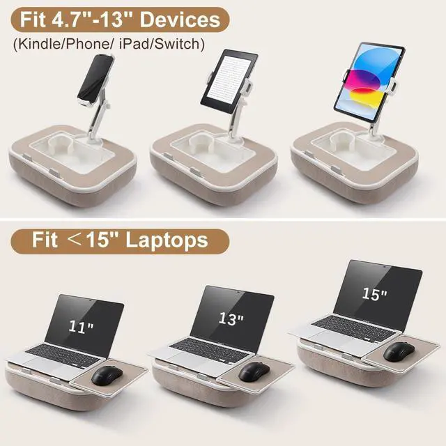 ^^ Fully Adjustable Viewing: Enjoy ultimate flexibility with 360 adjustment for the base and kindle stands holder, plus 270+180 adjustability for the supporting arm. Whether youre sitting or lying down, this phone pillow stand lets you find your ideal viewing angle effortlessly no tools needed. Its the ideal kindle pillow stand for reading in bed or couch use, freeing your hands for a more relaxed experience. ^^ Versatile Device Holder & Lap Desk: This tablet pillow stand fits kindlekindle stands), phones (phone pillow stand, ), iPads (ipad pillow holder), and tablets (tablet pillow holder) from 4.7" to 13". Remove the clip to create a sturdy laptop pillow for lap, ipad lap stand, or tablet holder for lap supporting 11-15" laptops. a true all-in-one lap pillow solution. ^^ Plush