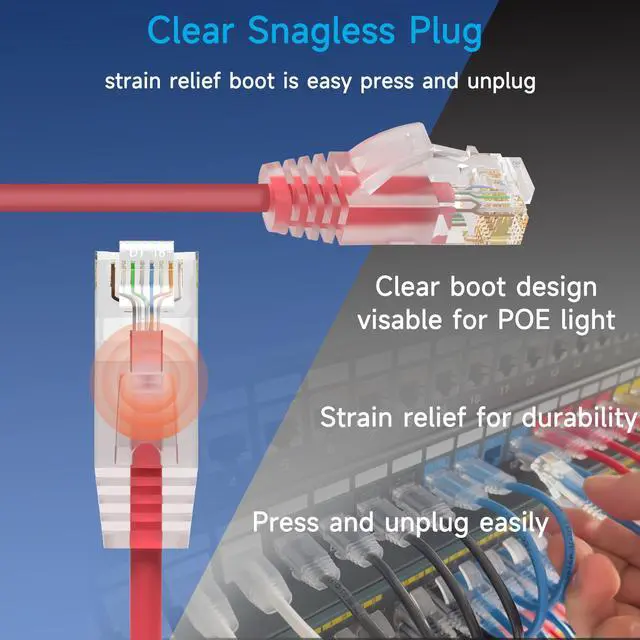 ^^ Clear Snagless Plug: Network patch cables are made of clear tap Snagless plug with strain relief boot for maximum durability. Cat6 patch cords with snagless plug is easy press and unplug. Clear boot of slim cat6 patch cable allows to see the light of the POE ports easily.
