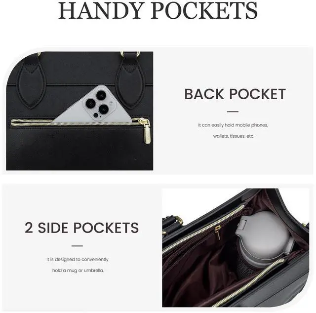 Durable Laptop Bag Crafted from durable, water-proof vegan leather with a polyester fiber lining, this work bag for women features a smooth metal zipper for easy access and a reinforced bottom with metal feet for added protection ^^ Large Capacity With dimensions of 16.2" L * 5" W * 12" H, it accommodates laptops up to 15.6 inches. The work bag features a thick protective foam pad and a secure Velcro strap, ensuring enhanced safety for both laptops and iPads ^^ Multi-pocket Handbag The main compartment incorporates various pockets for organized storage, including a laptop compartment, tablet compartment, large zipper pocket, two open pockets, a small zipper pocket, two pen slots.