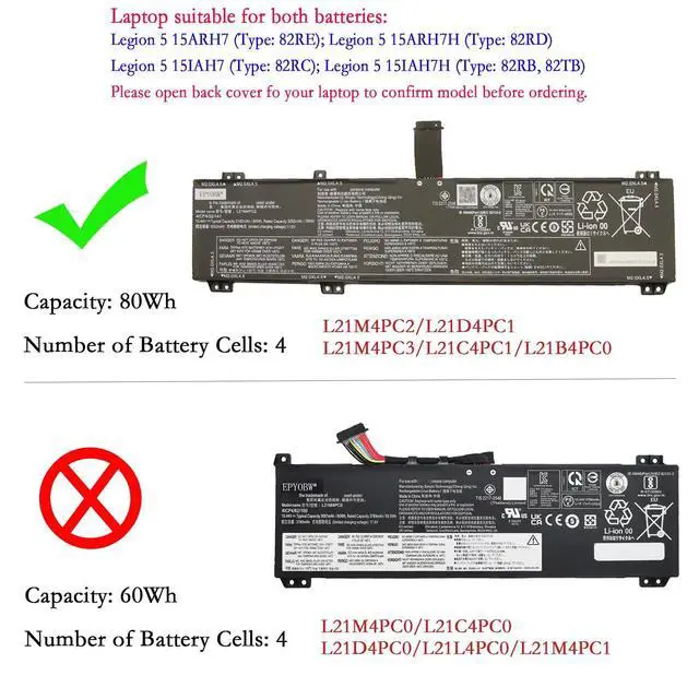 Pro 16ARH7H (Type: 82RG) Series. ^^ Purchase Skills Please open the back cover of the laptop before ordering and make sure that the original battery model is consistent with the listing. After getting the battery, please install the battery correctly, make sure that the battery connector is firmly connected to the laptop motherboard, and use the original charger to charge the laptop. Discharge the new battery to 5% (not 0%), then charge and cycle 3-4 times to wake up the new battery. ^^ EPYOBW Promise All EPYOBW's batteries are certificated by UL/CE/FCC/RoHS. Our batteries are tested by strict quality control standards to ensure that the capacity is true, stable current, low self-discharge. And we also have short circuit, overheat, and overload protections. We are confident in the performance of replacement batteries and professional service.
