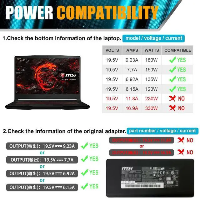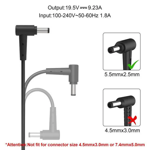 Size: 5.5 mmx 2.5 mm plug tip Note that the interface is consistent); Power charger compatible for MSI laptops in need of 19.5V 6.15A 120W, 19.5V 6.92A 135W or 19.5V 7.7A 150W power(NOTE: Not for Acer Predator Helios 300 gaming laptops nor for Dell laptops, NOT a 19.5V 11.8A 230W charger) ^^ Fit for MSI GV62 GV72 GS65 GS63 GS63VR GS43VR GS60 GS70 GS66 GS73 GS73VR GS75 GF63 GF75 GF62 GE62 GE62VR GE62MVR GE72 GE72VR GE72MVR GP70 GP60 GP62 GP72 GT60 GT70 PE70 GL62 GL62M GL72 GL72M WS60 WS65 WS75 WS63 WS72 WE62 WE72 GX60 P/N ADP-180MB K A17-180P4A A15-180P1A ADP-180EB D ADP-180NB BC ADP-180HB ADP-180HB B ADP-180HB D ADP-150NB D ADP-150CB ADP-120MH D 957-16GC1P-004 957-16F21P-116 957-16Q21P-103 957- 16H21P-004 957-16J91P-168(Detailed number drop down to see the details page! ) ^^ The connector is 5.5X 2.5MM, please make sure that there is no pin in your charger connector before purchasing. "NOTE Don't buy potentially inferior or dangerous chargers that can harm your laptop or worse! " ^^