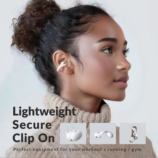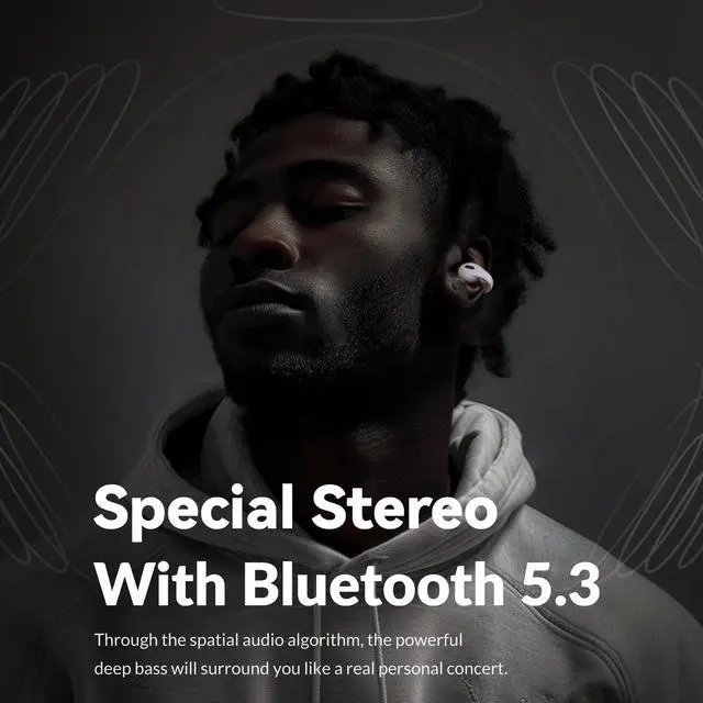 [Comfort to Clip On] Discover the perfect blend of comfort and customization with our open-ear wireless headphones. Designed with adjustable memory steel wire and skin-friendly silicone, they ensure a secure, irritation-free fit for any ear size. Enjoy your audio safely with our built-in hearing protection, ideal for prolonged use. ^^ [Powered by Bluetooth 5.3 ] Powered by the latest Bluetooth 5.3 technology, our clip on Bluetooth headphones offer a stable connection with ultra-low latency, ensuring your audio and video are always in sync. Experience immersive sound through our Spatial Stereo Audio Algorithm, designed to deliver rich, three-dimensional audio landscapes.