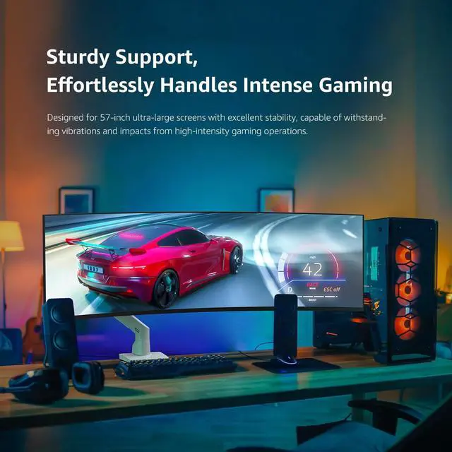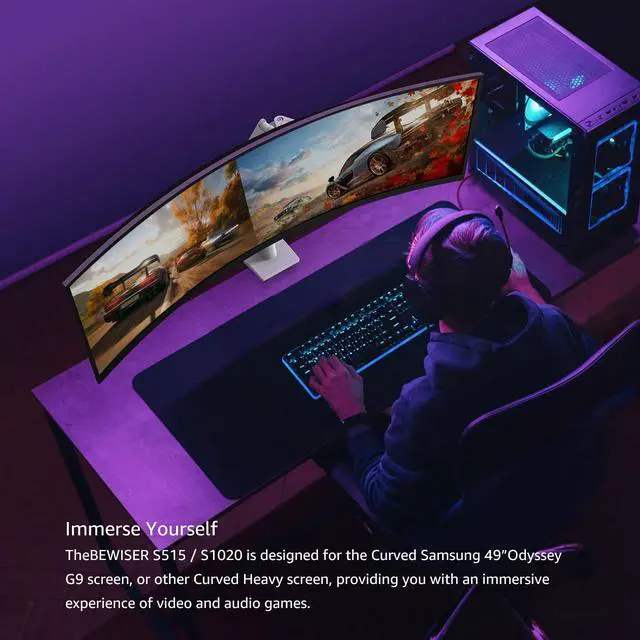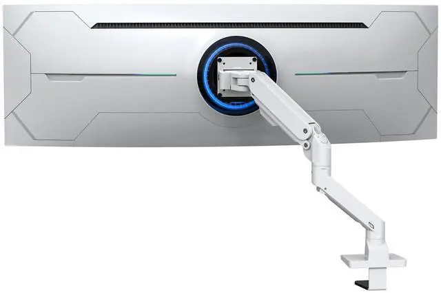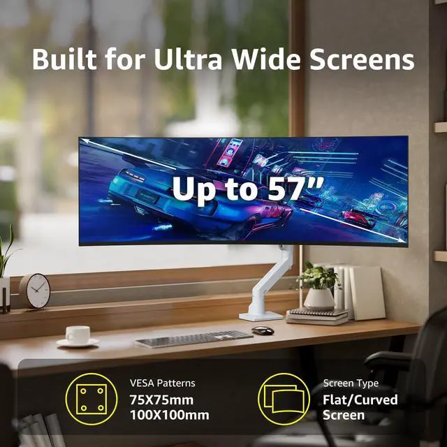 Suit For Ultra Wide Screens: BEWISER Heavy Duty Monitor Arm fits most 34-57 Inch Curved and Flat Screens. Heavy duty monitor arm securely lifts, turnsand tiltsultrawide monitors for an immersive viewing experience for work or gaming. Comes with interchangeable C-clamp or grommet base mount for use on desktops up to 2.4 inches thick.