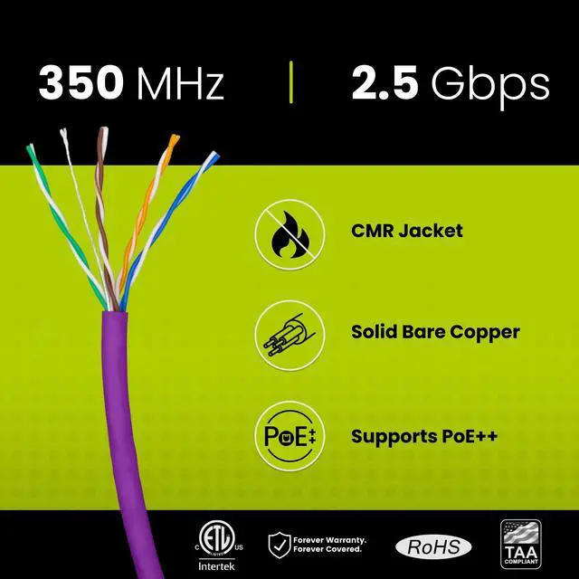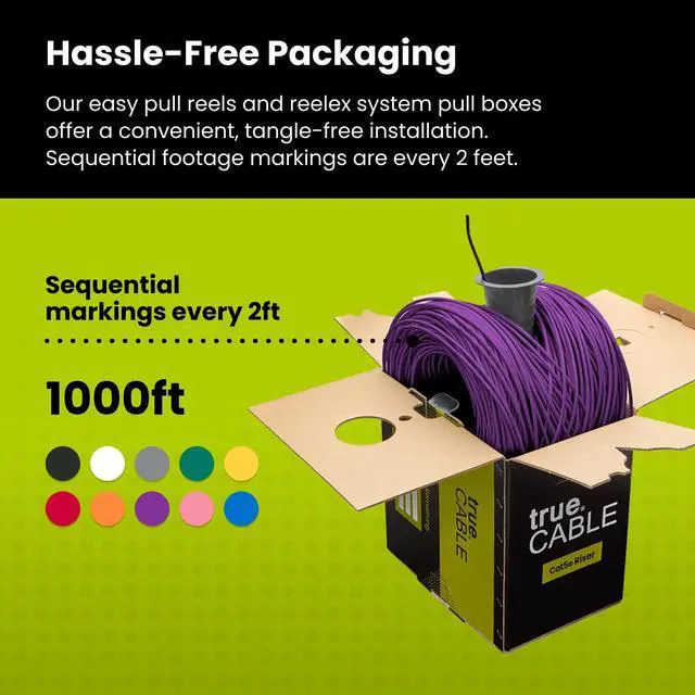 Supports Power over Ethernet: PoE/PoE+/PoE++ (IEEE 802.3 af/at/bt) 4PPoE up to 100W. ^^ [Hassle Free Packaging] 1000 feet (305 meters) comes conveniently pre-spooled in a tangle free, easy pull box so you dont have to worry about getting behind on your next job. ^^ [Solid Bare Copper Conductors] Pure bare copper conductors offer superior signal strength, conductivity, and flexibility compared to cheaper copper clad aluminum (CCA) options. Choose pure copper for a stronger, more reliable connection. ^^ [For Use Indoors] The purple riser rated jacket is for use in between floors, in wall, and non-plenum spaces. Help fires from spreading floor to floor in vertical installations with mild flame retardance. ^^ [ Certified by trueCABLE] Our data cables have been tested with a DSX-8000 Versiv CableAnalyzer and are in compliance with ANSI/TIA 568.2 -D standards, RoHS-3 compliant, and cETLus certified. Backed by our FOREVER WARRANTY. Compatibility & performance tested with trueCABLE RJ45 Connectors - B07XB3CPJK and B088KTYHMR