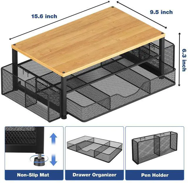 Ergonomic DesignOPNICE newly releases the monitor stand for desk organizer! This computer stand elevates your monitor or laptop to a comfortable viewing height, relieving pressure on your neck, shoulders. Ideal for strengthening office organization and increasing comfort levels ^^ Save SpaceThis 2-Tier monitor stand with drawer and 2 hanging pen holders provides ample storage space to keep your office supplies and office desk accessories neatly organized and easily accessible, keeping your workspace tidy and improving your sense of well-being ^^ Durable and StableThe metal computer stand is made of high quality material with sturdy construction, it can easily carry the weight of the display and computer accessories, to ensure stable and non-shaking for a long time, ideal for use in the office, dorm room or home ^^ Sleek and AestheticThis desktop organizer features a modern minimalist design that blends seamlessly with any office decor.