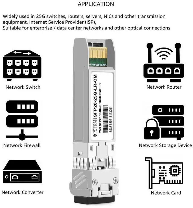 25GBASE-LR SFP28 Optical Transceiver Module 1310nm 10km DDM Duplex LC SMF. Built-in high performance Chip, Max. Power Consumption 1.2W Allowing for Prolonged Service Life, Commercial Temperature Range 0 to 70C (32 to 158F) ^^ Tested in Targeted Switches for Superior Performance, Quality, and Reliability. We owns compatibility LAB facilities to meet the EEPROM coding and writing requirements with various brands of networking equipments to ensure the reliability. ^^ Built-in Real Time Digital Optical Monitoring Capability for Strong Diagnostic Capabilities ^^ Hot Pluggable SFP28 MSA and RoHS Compliant to Uptime and Simplify Maintenance ^^ Compatible with CPRI option10 24.33G bps and 25GBASE 25.78G bps.