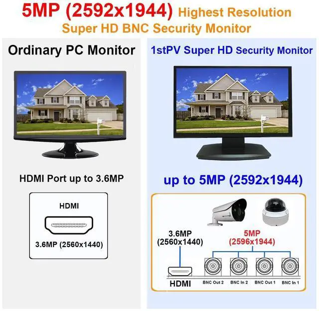 1. 23.6" Super HD 5MP/2592x1944 over Coax LED Security Monitor. Support up to 5MP/2592x1944 Super HD-TVI, HD-AHD, and 4MP HD-CVI. Super HD 5 megapixel (2592x1944) BNC resolution, which is 1.4 times higher than the 3.68MP (2560x1440) HDMI resolution from Normal PC monitors. ^^ 2. Keeps video looking its best by preventing blurry or pixelated images. Preserve original high video quality without artifacts, signal loss, or distortion caused by digital processing and compression through a Digital Video Recorder or Distributor. ^^ 3. 1 HDMI & 2 Super HD BNC Video Inputs.