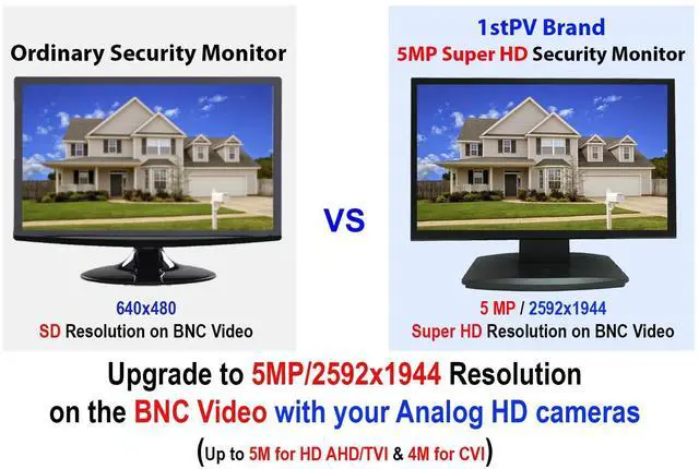 BNC video-in port works directly with the new Super HD security cameras without going through any DVR or converters. It will allow security cameras send clear video by using a single Coax cable to the HD monitor, and it can prevent fuzzy or unclear images between the camera, recorder, and monitor. ^^ 4. 2 BNC Video Outputs for Second Monitor. Comprehensive range of Super High Definition product line, including cameras, DVRs/NVRs, and Super HD monitors. ^^ 5. Super HD 5 megapixel (2592x1944) BNC resolution, which is 10 times higher than the Standard Definition ( 0.46MP /960H, 0.3MP /CVBS or VGA) BNC resolution from Normal CCTV/security monitors.