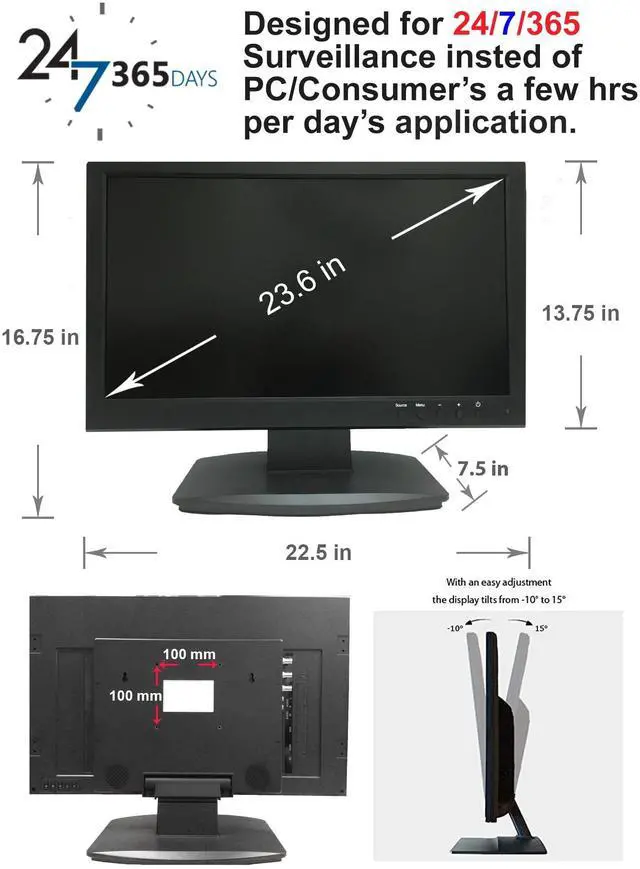 ^^ 6. Fast 5ms response time to avoid blurred motion monitoring and feed delays on critical moment. Auto display recovery after power interruptions. Construction-black plastic bezel and removable base. NTSC/PAL/SECAM auto detection. Desktop stand and standard VESA wall mount holes for desktop and wall mount installations. Wide view angle of 178 degrees for fewer restrictions on your range of vision. ^^ 7. This HD Monitor is design for professional surveillance/security applications, 24/7/365. Need help? Don't hesitate to contact us by email. We're here to assist you with any questions or issues.