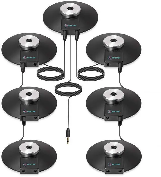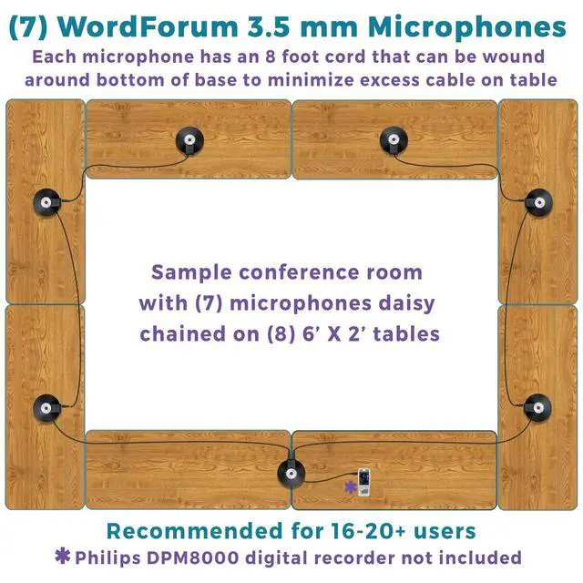 Equipped with a 3.5 mm TRS stereo plug compatible with any recording device that has a 3.5 mm TRS stereo powered jack (Not compatible with 3.5 mm TRRS 4 Pole jacks unless you have an adapter. ) ^^ Capable of recording multiple people speaking at once for meetings, teleconferencing, video conferencing, Zoom, SKYPE, VoIP (Voiceover Internet Protocol) Calls ^^ Connect additional microphones in series for cascading (daisy chain) option in multi-user applications ^^ Features wide frequency response for clarity and enhanced intelligibility with 360 degree boundary microphone with omnidirectional digital recording ^^ Includes (7) WordForum 3.5 mm TRS stereo conference microphones with 8 foot cord in zippered carrying cases