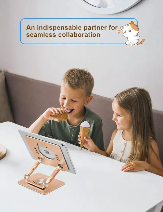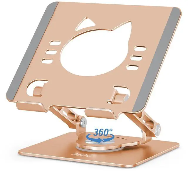 360 Rotation & Adjustable HeightThis tablet stand supports smooth 360 rotation with adjustable height and angles. Easily switch between portrait and landscape modes to keep your screen at a comfortable eye level and reduce neck, shoulder, and back strain during long desk or home use. ^^ Cute Cat Design & Gift-ReadyFeaturing a cute cat-inspired panel, this stand is especially appealing to cat lovers. The cat-shaped design helps improve heat dissipation and allows charging while in use. A practical gift choice for birthdays, Christmas, Mothers Day, Fathers Day, graduations, housewarmings, or back-to-school.