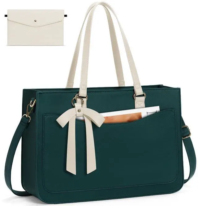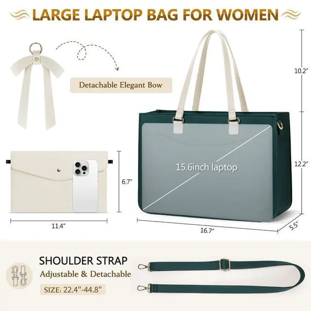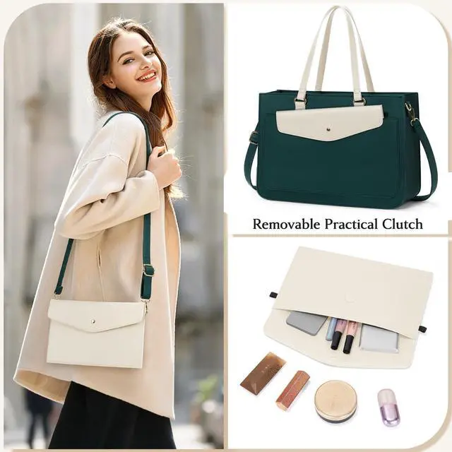 WORK TOTE BAG: This leather womens laptop bag comes with an additional clutch bag( 11.4" L x 6.7" H), perfect for storing small accessories, cables, cards, glasses and makeup, complementing the computer bag for coordination of fashion and functionality. The adjustable shoulder strap is 22.4" - 44.8" long, which can suit women of all heights and comfortable for wearing, making this bag easily transform into a briefcase for women, work shoulder bag, or laptop crossbody bag ^^
