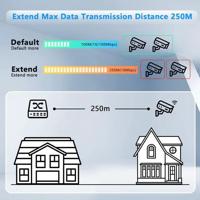 The fan-less design quietly integrates with your office environment and featured with good heat dissipationsafe to use in different environments from temperature -20 to 50 ^^ Extend and VLAN FunctionUp to 250m data and power PoE transmission range under Extend Mode, ideal for surveillance system (Speed will be reduced if extend function is operating). Port-Based VLAN When you enable VLAN mode, the PoE port is isolated with each other, but communcate with uplink ports, improve network performance.