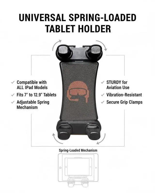 Fly with Confidence Rugged yoke clamp keeps your phone or iPad Mini secure even in heavy turbulence. Trusted by thousands of GA pilots for stable, wobble-free flights. ^^ Works with All iPads & Phones Fits iPhones, Androids, and iPads (including with thick cases). Clamp opens to 4.2" wide perfect for any cockpit setup. ^^ Total Control Rotate, tilt, and adjust on the fly. Quickly switch from portrait to landscape with one hand perfect for charts, ForeFlight, or checklists. ^^ Tool-Free Setup Mounts directly to yoke in less than 30 seconds.